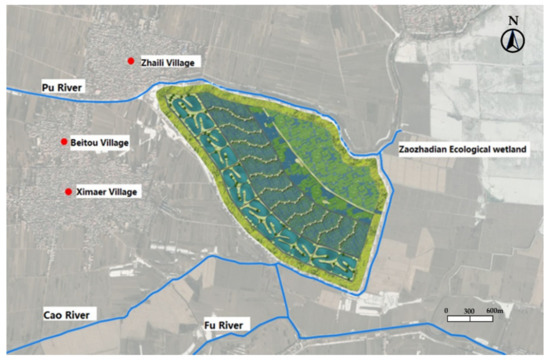 Baiyangdian Lake, known as the “Kidney of North China”, is crucial as a critical node for maintaining the ecological balance of North China, regulating the climate of the Hebei Plain and even the Beijing-Tianjin region, supplementing groundwater sources, regulating floods, and protecting biodiversity and rare species resources [27]. With socio-economic development, the volume of water entering Baiyangdian Lake has gradually shrunk, resulting in serious fragmentation of the wetland ecological landscape, gradual reduction of the ecological function and the decrease of biological species year by year [28,29]. The PuRiver, Cao River and the Fu River are the three upstream rivers of Baiyangdian Lake. As they flow through towns and cities, the discharge of agricultural non-point source pollution, domestic sewage, and tailwater from sewage treatment leads to poor water quality of the rivers [30]. These are the main pollution source of Baiyangdian Lake, especially in the western part. The water quality is directly related to the water safety of Baiyangdian Lake [31]. In September 2020, the construction of the water quality purification project at Fu River estuary was completed. Its function is to purify the three rivers and increase the stability of the ecosystem of estuary. The project is located in the north of Anxin Jianchang Village, near Zhaili Town, where three rivers converge. The geographical location is shown in Figure 1.