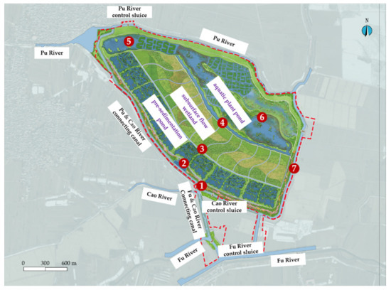 The project adopted the combination process of “pre-ecological sedimentation pond + subsurface flow constructed wetland + macrophyte pond”, covering 3.15 km2 in total, with a daily processing capacity of 250,000 tons. It was divided into three parts and covering area of 0.82 km2, 1.02 km2 and 1.31 km2, respectively, as shown in Figure 2. The pre-sedimentation pond was the first treatment unit of the water purification project in the Fuhe estuarine wetland. Its main function was to precipitate the suspended matter and reduce the sand content in the river, at the same time, degrade the complex pollutants initially under the action of microorganisms and plants to further improve the biodegradability of the pollutants for the subsequent biochemical treatment of pollutants. The subsurface-flow wetland took over the effluent of the ecological sedimentation pond and relied mainly on the action of the roots of macrophytes, microorganisms and substrates to remove pollutants. The aquatic plant pond consisted of two parts, the front part is the submerged plant area, and the back end is the emerged plant area, which purified the water through the action of microorganisms and plants.