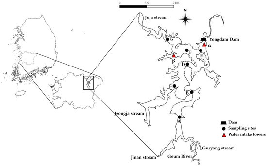 The study area, Yongdam Reservoir, is located at 35°57′50″–35°49′08″ N, and 127°26′08″–127°32′54″ E in Jeonbuk Province, South Korea (Figure 1). The reservoir was created in 2001 by constructing Yongdam dam on the upstream Geum River for the purposes of flood control, hydroelectric power generation, and water supply to agricultural and urban areas in the western half of the province. More than a million people are currently benefitting from the construction of the reservoir. The reservoir has a surface area of 36.24 km2, with a water storage capacity of 8.15 × 108 m3, and an average water retention time of 191 days. It is the fifth largest reservoir in the nation in terms of storage capacity. Two water intake towers are installed near the dam (site α in Figure 1) at the western section of the reservoir (site β). Each tower can withdraw water from the five equally spaced gates from an elevation of 226.5 to 261.6 m. The gates are flexibly operated depending on the water level at the time of withdrawal. Tower α was installed to supply water to downstream Geum River, and water taken at tower β is supplied through an aqueduct tunnel to the Gosan power station and water treatment facility 21.9 km away. The reservoir is surrounded by a mixed watershed with a total area of 930 km2, about 71.1% of which is forest, followed by agricultural, undeveloped, and city area each constituting 14.7, 6.0, and 1.8%, respectively. There are five tributaries flowing into the reservoir; Geum River and Guryang, Jinan, Jeongja, and Juja streams. The first three join and enter the reservoir at the southern end and constitute the majority of the inflow, and the urbanized area and the pollution sources are predominantly located in their watersheds.