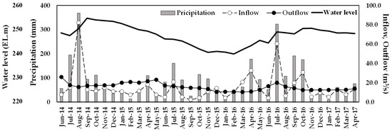 A variation in the precipitation patterns induced changes in reservoir operation, affecting the water balance of the reservoir. Mostly negative monthly water balance was observed after the monsoon from September 2014 until an increase in precipitation was recorded in the Spring of 2016. The average inflow and discharge in 2015 were 10.0 and 17.4 m3/s, respectively, and a slightly positive balance was observed only in July and December. A positive balance in the Summer and negative in the winter, the typical characteristics in the reservoirs in Korea [45,46], were observed in 2016 with average inflow and discharge of 18.3 and 13.4 m3/s, respectively. Water balance directly affected the water level of the reservoir, and a consistent decrease from 254.6 m in September 2014 was observed until the lowest level of 239.8 m was recorded in February 2016.