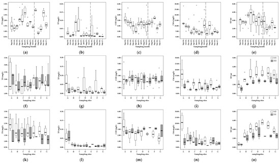 Box-and-whisker plots showing spatial distribution and average values in each sampling event (a–e) and temporal distribution and average values at each location (f–j; subperiod 1-1 and 2-2, k–o; subperiod 1-2 and 2-1) of total nitrogen (TN), total phosphorus (TP), chemical oxygen demand (COD), chlrophyll a (Chl-a), and Secchi depth (SD). The dotted lines in a–e were inserted for the division between the two sampling periods.