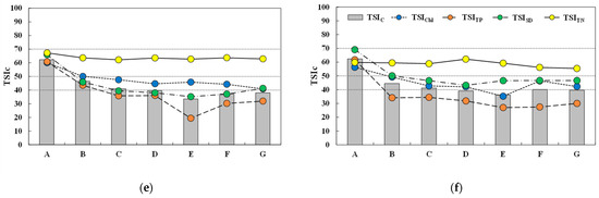 TSIs on the Chl-a, TP, and SD of the reservoir were calculated using the methods proposed by Carlson [20]. The Carlson’s TSI (TSIC) can be obtained by calculating the arithmetical average of the three TSIs. TSI has the advantage of presenting the trophic state on a continuous numeric scale. Waters with TSIs less than 40 are categorized as oligotrophic, 40 to 50 mesotrophic, 50 to 70 eutrophic, and higher than 70 hypereutrophic [21,42]. TSITN was also calculated using the method in the literature [21]. The equations used for the calculation of TSIs were: