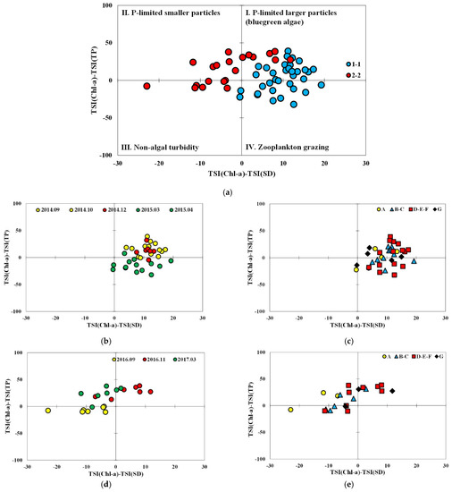 The data from subperiod 1-2 were mainly distributed in the first quadrant, followed by the second and a few in the third while many of the data in subperiod 2-1 were located in the third quadrant followed by similar numbers in both the first and second quadrant (Figure 6). Most data of subperiod 1-2 in the months before (June) and after (October) the typical monsoon season were located in the first quadrant, while those in July and August were rather evenly distributed on either side of the axis indicating TSIChl = TSISD. In the case of subperiod 2-1, the data in the Spring (May 2016) were dispersed in the first, the second, and the third quadrant. Among the monsoon season data, the ones in the non-algal turbidity area were mainly from September 2016 and those from August were in the first and the second quadrant. Precipitation in September was significantly higher than that in August.