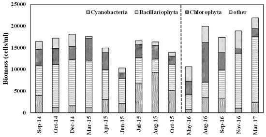 Summarizing the results of the TSID distribution and the temporal changes in the phytoplankton community, it can be found that total cell concentrations were higher in the Summer of 2016, while the fraction and absolute concentration of blue-green algae were significantly higher in the corresponding period of 2015 when the weak monsoon period occurred in the Summer. Higher total cell concentrations and a gradual increase from the monsoon season in 2016 might imply that a normal Summer monsoon favored the diversity of the algal community. As for the blue-green algae, whose undesirable biological characteristics make them one of the primary management targets in many reservoirs, very large concentrations in the Summer of 2015 indicates the possibility that drought conditions induced by a weak Summer monsoon fosters explosive growth of the algal population [83]. Among the factors that have been known to favor the growth of blue-green algae, the stability of the water column due to reduced input from tributaries, high P concentration, and/or zooplankton grazing might render conditions that favor them. Although determining the growth of blue-green algae has most frequently been attributed to the N/P ratio, nutritional control in general was not huge in this reservoir where trophic conditions corresponded to oligotrophic or mesotrophic conditions.