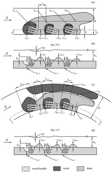 (a) Plan and (b) cross-sectional views of the wood bundle structure series along with important hydraulic and scour parameters in the case of straight channels; (c) plan and (d) cross-sectional views of the wood bundle structure series in the case of curved channels.