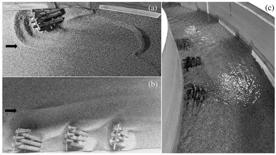 All the tests were conducted with uniform bed material, characterized by the following granulometric properties: median diameter d50 = 1 mm, sediment non-uniformity parameter σ = (d84/d16)0.5 = 1.15, where dxx signifies the sediment diameter size for which xx% of material is finer. The bed material and water density are denoted by ρs and ρ, respectively. In the present study, ρs = 2467 kg/m3 and ρ = 1000 kg/m3. The bed material was chosen in accordance with the criterion d50 > 0.8 mm to avoid viscous and sediment cohesive effects [28]. Figure 3a,b show the equilibrium scour morphology due to wood bundles in curved and straight channels, respectively. Figure 3c shows the curve of the channel in which a series of three structures is located. The experimental conditions and results are listed in Table 1.