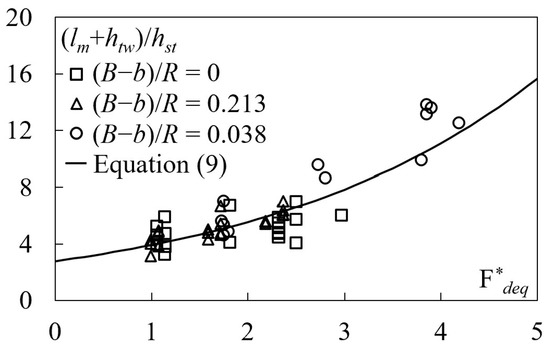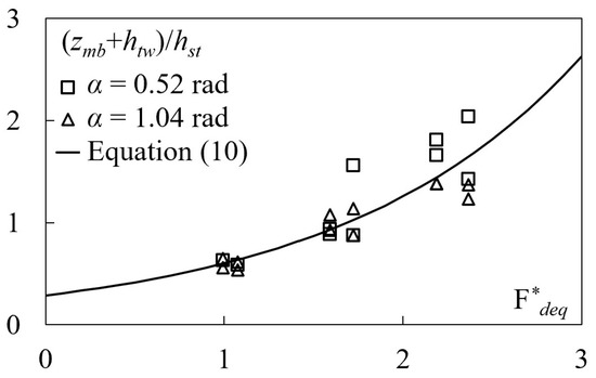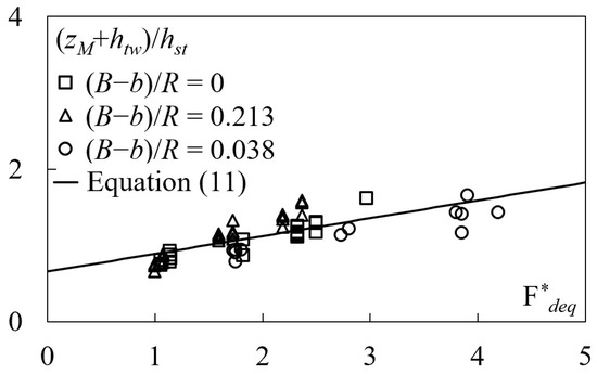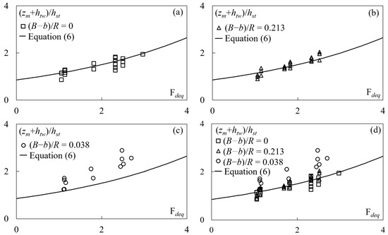 For the tested conditions, (zm + htw)/hst was plotted against Fdeq (Figure 4), along with the plot of Equation (6), which predicts experimental data pertaining to structures located in straight channels (Figure 4a) (and in the inner bank of a curved channel, as shown in Figure 4b). Note that Equation (6) is valid for 1 < Fdeq < 3 and 0.85 < (zm + htw)/hst < 2.9.