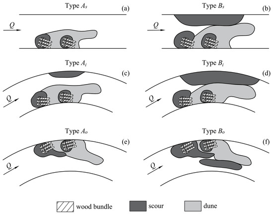 Scour morphology types for wood bundles in straight and curved channels: Types (a) As and (b) Bs for the straight channel, i.e., (B − b)/R = 0; Types (c) Ai and (d) Bi for the curved channel inner bank position, i.e., (B-b)/R = 0.213; Types (e) Ao and (f) Bo for the curved channel outer bank position, i.e., (B − b)/R = 0.038.