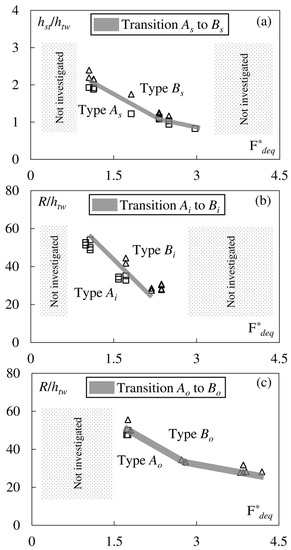 The fields of existence of the equilibrium scour morphology types described above were established based on the parameters hst/htw, R/htw and F*deq, following the methodology proposed by [20,24]. Therefore, in Figure 10a, hst/htw values are plotted against corresponding F*deq for (B − b)/R = 0. Keeping F*deq constant by lowering the tailwater level, a transition from Type As to Bs occurred. This could be explained by a corresponding decrease in the jet diffusion length, which caused a proportional increase in the shear stress and scouring capacity, resulting in Type Bs being characterised by more pronounced scour holes in the structure vicinity and far bank of the channel [12,13]. In addition, when other parameters were constant, higher Froude numbers could be associated with higher velocity, which facilitates scour formation and results in scour morphology Type Bs (Figure 9b). Figure 10b,c show plots of R/htw vs. F*deq in the case of the inner bank position, i.e., (B − b)/R = 0.213 and outer bank position, i.e., (B − b)/R = 0.038, respectively. However, the fields of existence of the different scour morphologies in these cases showed the same characteristics as those of straight channels. For both inner and outer bank positions, a transition from Type Ai (Ao) to Type Bi (Bo) could be obtained by a decrease in htw or an increase in F*deq values for otherwise constant hydraulic and geometric conditions. Moreover, Type Ai and Ao did not occur for Froude numbers greater than two in the curved channels because of the effect of channel curvature, which facilitated the formation of extended scour zones in the outer bank vicinity, resulting in Type Bi or Bo (Figure 9d,f).