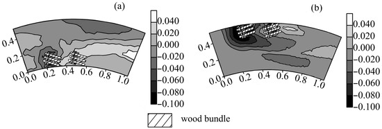 Figure 11 shows scour maps corresponding to tests 4 and 3, with identical discharge, structure position and geometry (Q = 0.008 m3/s, n = 1 and (B − b)/R = 0) but with different tailwater level and scour morphology, such as (a) htw = 0.06 m and Type As and (b) htw = 0.042 m and Type Bs. In fact, by decreasing the tailwater level we obtained a transition from Type As to Bs, which corroborates the findings reported in Figure 10a. In Figure 12, two scour maps are presented, corresponding to tests 38 and 49, with similar hydraulic and structure characteristics (Q = 0.011 m3/s, n = 2, α = 1.04 rad and htw = 0.07 m) but with (a) inner bank position, i.e., (B − b)/R = 0.213 and Type Bi and (b) outer bank position, i.e., (B − b)/R = 0.038 and Type Bo. On comparison of the two figures, it can be concluded that the scour in the vicinity of wood bundles becomes more pronounced in case of Type Bo compared to that in Bi due to the effect of the channel curvature. However, the wood bundles located at the outer bank are successful in partially directing the stream flow towards the centre of the channel, which results in an eco-friendly scour pool, as shown in Figure 9f. In general, in both straight and curved channels, the localised scour holes in the vicinity of the wood bundle structure can act as resting spots for fish, and the elongated dune region can be used as a spawning site. However, in case of Type Bi and Bo, suitable countermeasures should be designed to ensure bank protection. The central scour pool formed in the case of Type Bo can help to create and sustain bio-diversity in the channel.