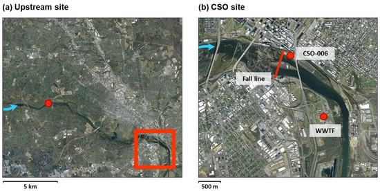 (a) Map of study area showing the direction of water flow (blue arrows) and the location of the upstream sampling site (red circle). The red inset box is expanded in panel (b) to show the sampling site at the CSO discharge point, the location of the city′s wastewater treatment facility (WWTF), and the approximate fall line of the James River.