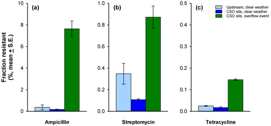 Samples collected from the upstream site during clear weather (left bar, light blue), the CSO-impacted site during clear weather (center bar, dark blue), and the CSO-impacted site during an overflow event (right bar, green) were analyzed to determine the fraction of the culturable bacterial community resistant to either: (a) ampicillin, (b) streptomycin, or (c) tetracycline. Note the difference in scale on the y-axis.