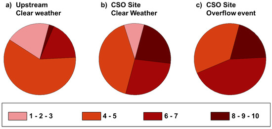 A Kruskal–Wallis test revealed a statistically significant difference in MDR between the samples (H = 22.1, p < 0.0001). Isolates from the upstream site had significantly lower levels of MDR (4.5 ± 0.2 S.E.) compared to the CSO site during either clear weather (5.8 ± 0.3) or the overflow event (6.2 ± 0.2) (Dunn′s post hoc, p < 0.001). The difference in MDR between the two sampling events at the CSO site was not significant (p = 0.16).