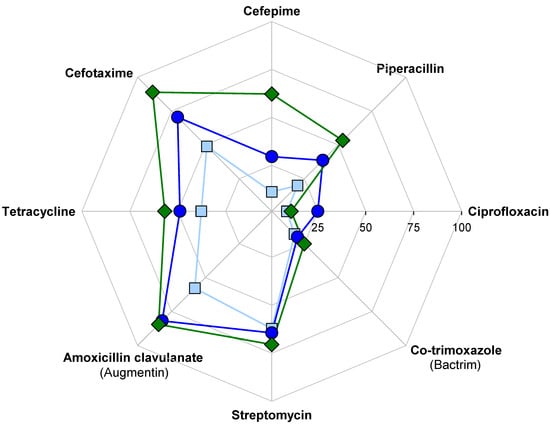 Following disk diffusion methods in the Manual of Antimicrobial Susceptibility Testing [37], archived isolates were tested using the log phase method, with the inoculum reaching the 0.5 McFarland turbidity standard in no longer than 24 h. Once cultures reached the 0.5 McFarland standard, they were spread on Mueller–Hinton agar plates (BD Difco) and incubated at 35 °C for 16–18 h, after which time the zone of inhibition surrounding each antibiotic disk was measured. E. coli (ATCC 25922, Manassas, VA, USA) was used as a control and tested with each batch of samples.
