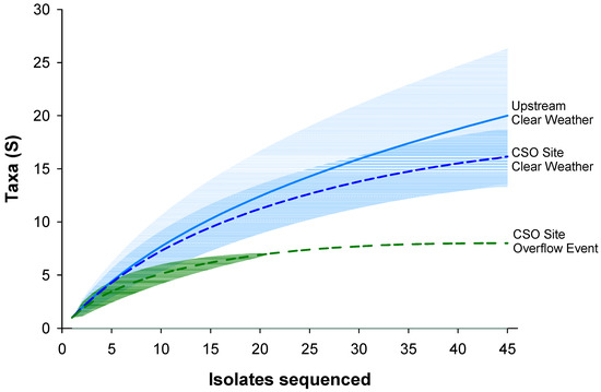 Representative matches with >99% sequence identity at the species level were found for 118 of the 134 isolates. For the other 16 isolates, representative matches were all >98.3% similar. Classifications comprised 20 families and 30 genera. Diversity was highest for both samples collected during clear weather, and significantly reduced when the CSO site was sampled during overflow conditions (Figure 5). Rarefaction indicates the sampling effort was adequate to capture the diversity of culturable ampicillin-resistant organisms (Figure 5).