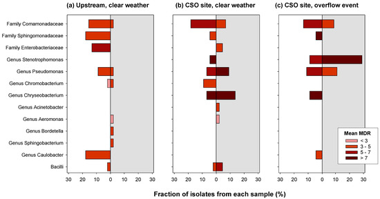 The diversity of MDR isolates was highest at the upstream site and significantly lower at the CSO site during the overflow event (Figure 5). This is consistent with several prior studies that have documented reduced diversity in environments experiencing wastewater pollution [66,67,68]. In our study, nearly all (97%) isolates were Proteobacteria and Bacteroidetes, which are among the phyla most commonly reported in rivers, tap water, and wastewater [69,70,71]. These phyla are recognized as major reservoirs of AR among environmental bacteria and include both antibiotic producers and degraders [72,73,74,75]. The majority of isolates were included in classes of ubiquitous Proteobacteria, specifically Alpha-, Beta-, and Gammaproteobacteria (87%) which includes many species found in the human microbiome [69,76]. Interestingly, 75% percent of the isolates classified as Gammaproteobacteria were obtained from the CSO site. This class includes several medically important groups, including Enterobacteriaceae and Pseudomonadaceae. Well-known pathogens such as Pseudomonas aeruginosa, Escherichia coli, and Salmonella are part of these groups. As hypothesized, potentially pathogenic isolates were more common at the CSO site and exhibited a greater level of MDR (Table 2 and Figure 6). In contrast, the upstream site included a greater abundance of the family Sphingomonadaceae and the genus Caulobacter. Sphingomonadaceae are commonly isolated from soils, freshwater, and marine habitats [77], and Caulobacter have been reported from a wide variety of aquatic habitats, mainly freshwater [78,79].