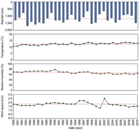 In this study, we obtained meteorological data for the period from 1980 to 2010: rainfall data from the Oryu rainfall station, and temperature, relative humidity, and wind speed data from the Cheongju weather station near the GH reservoir (Figure 2). The data were provided by the Water Resources Management Information System [22]. Figure 2 indicates an annual average rainfall of 1182.9 mm, an average temperature of 12.4 °C, relative humidity of 67.9 %, and an average wind speed of 1.8 m/s for the study area. The water-level storage curve data and the GH reservoir’s water-level data required for the water balance analysis were obtained from the Korea Rural Community Corporation [23]. The reservoir storage rate data from 1991–2010, a year before the start of the embankment-heightening project, were used to validate and calibrate the reservoir simulation operation. For the climate change scenario, which includes future climate change information, RCP daily data for the Korean Peninsula with a 12.5 km resolution was simulated with the global climate model (HadGEM2-AO) at the Meteorological Agency Hadley Centre, the United Kingdom. These data are provided to the public by the Climate Change Information Center [24] for establishing national-level climate change adaptation measures in South Korea.