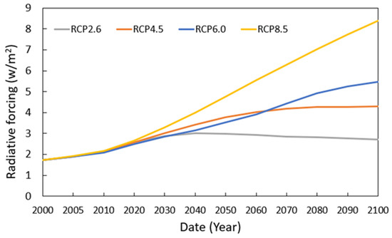 In this study, RCP greenhouse gas (GHG) scenarios were selected for future climate data construction. The RCP scenarios were introduced in the fifth assessment report of the Intergovernmental Panel on Climate Change (IPCC) [1]. They are classified into RCP 2.5 (a case which demonstrates the recovery of the earth from the effects of human activities), RCP 4.5 (a case in which GHG reduction policies are substantially realized), RCP 6.5 (a case in which GHG reduction policies are marginally realized), and RCP 8.5 (a case in which GHGs are discharged without reduction) according to radiative forcing. Figure 3 shows the trend of radiative forcing in the RCP scenarios [25]. The carbon dioxide concentrations for RCP 2.6, 4.5, 6.0, and 8.5 are 420, 540, 670, and 940 ppm, respectively. RCP 4.5 and RCP 8.5, with different GHG reduction policies, were selected for this study.