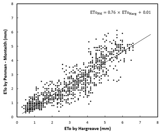 Relationship between evapotranspiration by the Hargreaves and Penman–Monteith method.