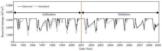 Before applying future climate change information, the reservoir simulation operation was calibrated and validated to ensure the reliability of the past simulation results. In terms of the period setting, the calibration period was from 1994 to 2001, and the validation period was from 2001 to 2009. The suitability of the reservoir simulation operation results was evaluated by the determination coefficient (R2) of the observed and simulated water storages, the Nash and Sutcliffe model efficiency (NSE), and the percent error (PE), as shown in Equations (11)–(13) [33,34].