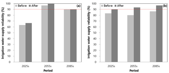 Before the reservoir-heightening project, the water supply safety was the lowest at the beginning of the 21st century under RCP 4.5. However, it was equal to the design criterion or higher in the middle and end of the 21st century. In RCP 8.5, the overall irrigation water supply capacity was lower than the design criterion in all periods. In particular, the irrigation water supply was the lowest in the 2025 period of RCP 4.5. This is because the future runoff was higher than in the past.