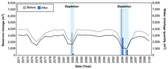 Figure 7 shows the comparison of the annual average storage and water shortage quantity before and after embankment heightening in the 2085s in RCP 4.5. The water balance analysis that applied the full water level and climate change data only affected the lack of water storage. The water shortage quantity after heightening tended to decrease, which highlights the inability of the reservoir-heightening project to prevent reservoir depletion completely.