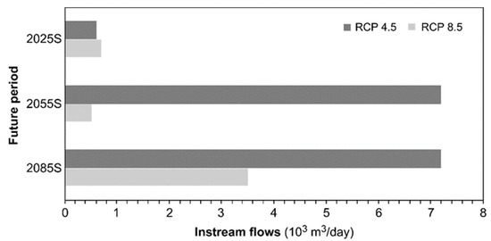 The future instream flows were 0.6, 7.2, and 2.8 × 103 m3 for the 2025s, 2055s, and 2085s under RCP 4.5, respectively, and 0.7, 0.5, and 3.5 × 103 m3 under RCP 8.5, respectively. Herein, the result of the 2025s period in RCP 4.5 was calculated in the water supply safety condition range of the period before reservoir embankment heightening for which no decrease occurred. Consequently, the instream water supply range was 0.6–7.2 × 103 m3/day in RCP 4.5 and 0.5–3.5 × 103 m3/day in RCP 8.5.