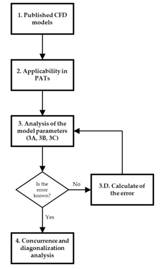 - Concurrency and diagonalization. Based on the information collected and the results of the calculations, a concurrency and diagonalization analysis was performed to identify the number of investigations according to the type of PATs and to identify the main CFD modelling parameters used in successful experiences.
