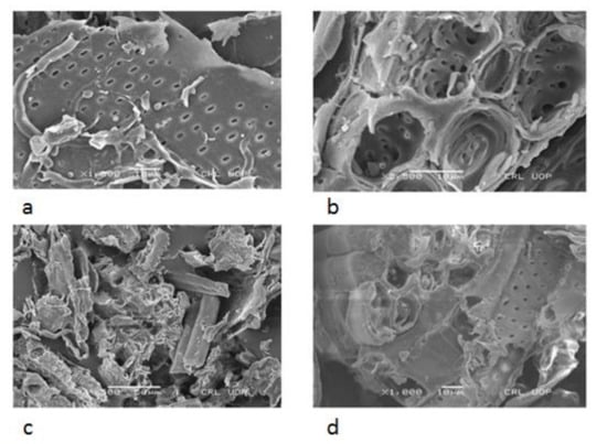 SEM images of sawdust at various magnifications (a) ×1000, (b) ×2500, (c) ×50 and (d) ×1000.