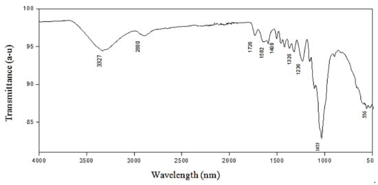 The FTIR analysis (Figure 4) of carbonaceous adsorbents give knowledge about the functional groups that are responsible for the attachment of adsorbates to its surface and can be inferred from the existence of distinctive frequencies. Figure 4 shows FTIR spectrum of activated sawdust sample. The peak at 3327 cm−1 provides details on the availability of the hydroxyl group (O-H) that may be a part of carboxylic acids, alcohols and phenols present in cellulosic fibers, lignin and pectins. Peak at 2880 cm−1 indicates CH3 stretching. The peak at 1728 cm−1 shows the stretching vibration of carboxylic acid and ester C-O bonds []. The peak at 1582 cm−1 represents COO-deprotonated carboxylate group. The peak observed at 1328 cm−1 suggests the stretching vibrations of pectin (-COOH) []. The obtained peak at 1233 cm−1 shows hemicellulose C-O stretching vibration and suggests the importation of hemicellulose C-O vibration. The presence of halogen group C-X on sawdust is suggested by the peak observed at 1035 and 535 cm−1 [].