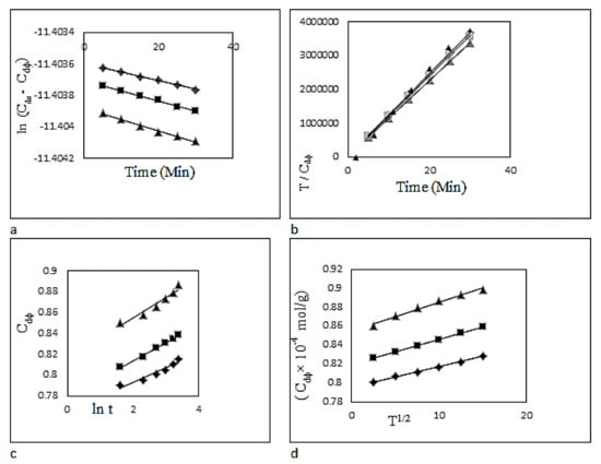 where kip is diffusion rate constant and C is the thickness of the liquid film that can be obtained from intercept of × 10−4 vs t/2 plot Figure 6d. The straight-line of the graph shows that the adsorption process is a directly controlled by diffusion and if it does not pass by the center in with many linear sections, it may suggest that boundary diffusion is not the only step involved as a mechanism. The values of calculated parameters are shown in Table 2