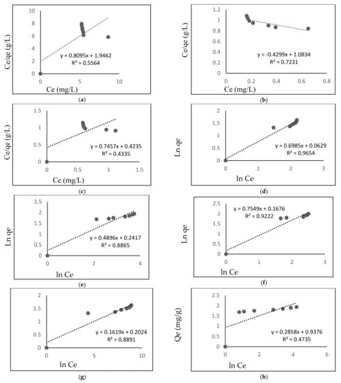 Based on the variance and difference in the related surface area and the adsorbent surface pore volume, KL = Langmuir constant interlinked with removal efficiency, which means that the greater and maximum adsorption potential is due to the huge surface area and massive amount of pores. If the adsorption process follows the isothermal model of Langmuir, the graph constructed in Figure 7a–c has a straight line (between Ce/qe and Ce). The values of the constants are given in Table 3 along with R2 values.