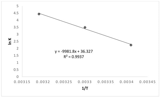 This adsorption isotherm model is commonly used for gas phase adsorption and deduces that with the adsorbent saturation the adsorption energy sequentially decreases []. The linear form of this model can be given as follows [,,]: