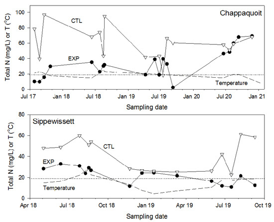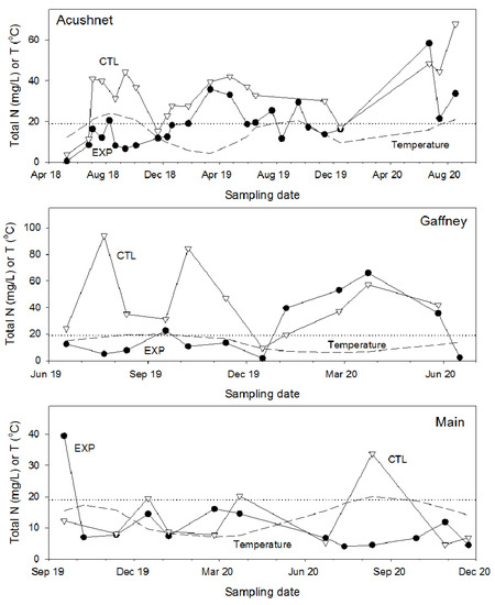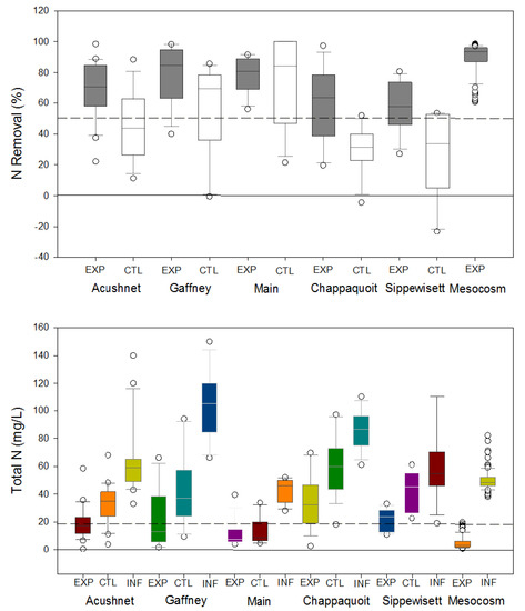 - Ross, B.N.; Hoyt, K.P.; Loomis, G.W.; Amador, J.A. Effectiveness of advanced nitrogen–removal onsite wastewater treatment systems in a New England coastal community. Water Air Soil Pollut. 2020, 231, 1–10. [Google Scholar] [CrossRef]