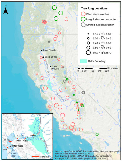 Prior to development of the Central Valley and the San Francisco Estuary, the Sacramento, San Joaquin, and other rivers that drain the region had insufficient capacity to carry peak wet season flows generated by precipitation and snowmelt runoff. Rivers overflowed their natural levees in most years and discharged into adjacent low-lying basins, thus attenuating runoff to the Delta. As these flood flows receded, the low-lying basins would partially drain back to the rivers through smaller channels and sloughs; however, the basins typically remained inundated through late summer [32,33] Seasonal overtopping of the pre-development levees supported inland marshes [24,34,35,36], while riparian forests existed on natural riverbanks [37] and grasslands interwoven with vernal pools and valley oaks extended from the floodplains to the tree-covered foothills [38,39,40]. Water use by natural vegetation [41], in combination with the annual cycle of flooding, reduced the amount of precipitation and snowmelt runoff that reached the Delta. As natural levees were raised and wetlands and riparian forests were drained and cleared, water use by agriculture replaced water use by native vegetation in the Central Valley and the Delta. Fox et al. [24] estimated that annual water use from the natural landscape was similar to that of the highly altered contemporary landscape, such that freshwater flow reaching the estuary (i.e., Delta outflow) was minimally changed. In contrast to the Central Valley and Delta, land use changes in the surrounding foothill and mountain watersheds have been relatively minor [24]. The remainder of this section reviews previous efforts to characterize pre-development conditions using tree-ring data and flow–salinity modeling approaches.