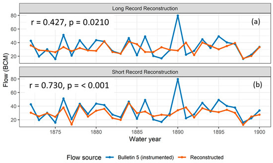Time series plots (WYs 1872–1900) comparing reconstruction of Central Valley runoff (Model 1) with instrumented flows for (a) long record reconstruction and (b) short record reconstruction. Spearman correlations and significance annotated. Significance not adjusted for autocorrelation because none of the series are positively autocorrelated. This period, as documented in Bulletin 5 [65], precedes years used for calibrating and validating reconstruction models.