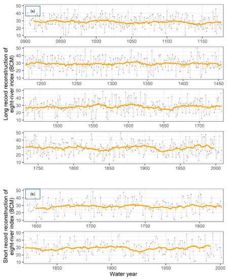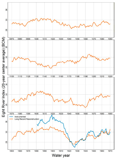 where outflow and runoff volumes are in units of BCM per year and α1 and α2 are fitting parameters determined through least squares analysis [25] simulated pre-development conditions in the Central Valley and Delta assuming a historical runoff pattern measured over the 93-year period spanning WYs 1922–2014. Annual Delta outflow volume from the CDWR simulation, along with annual Central Valley runoff (as measured by the 8RI over the same 93-year period), were used to calibrate Equation (2). Tree-ring reconstructions of Central Valley runoff (i.e., the 8RI) were used in conjunction with Equation (2) to estimate pre-development annual Delta outflow volumes through WY 1850.