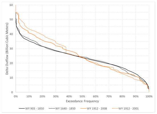 Pre-development Central Valley hydrology and Delta outflow were characterized by the California Department of Water Resources (CDWR) [25] utilizing two models to simulate watershed hydrology. They used the Soil Water Assessment Tool (SWAT) [57] to model precipitation–runoff characteristics of the upper elevation Central Valley watersheds and the (California) Central Valley Simulation Model, or C2VSim [58], an integrated hydrologic model, to simulate groundwater and surface water hydrology on the pre-development Central Valley floor. Land use was based on prior characterizations of natural vegetation [24,59]. Potential evapotranspiration from natural vegetation was estimated using reference evapotranspiration from Orang et al. [60] and vegetation coefficients from Howes et al. [41]. CDWR [25] estimated a long-term annual average pre-development Delta outflow of 23.9 billion cubic meters (BCM) assuming a repeat of a 93-year contemporary climate sequence spanning WYs 1922–2014. Gross et al. [22] utilized these modeled values to compare inter- and intra-annual variability of pre-development and contemporary Delta outflow.
