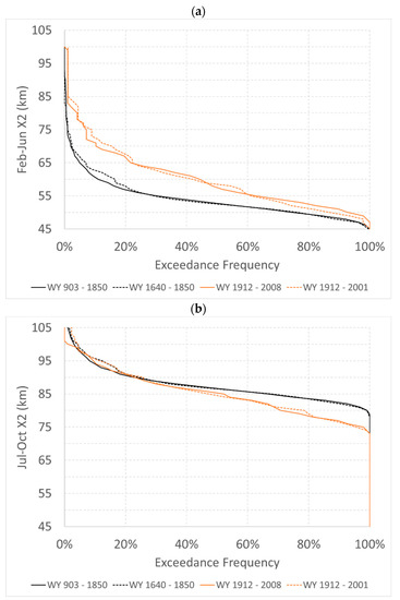 Seasonal (February–June and July–October) average pre-development X2 positions were estimated for the reconstruction periods assuming power law relationships between X2 position and annual Delta outflow volume: