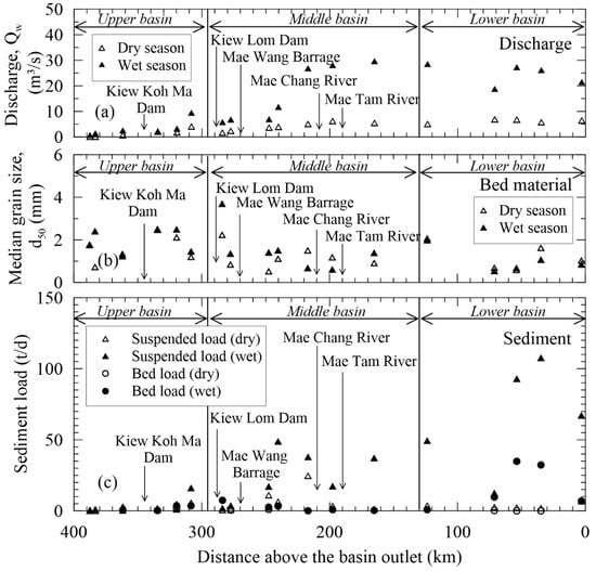 The Wang River Basin is a dendritic drainage basin. River gradient in the upper and middle Wang River reaches is characterized as mountainous (1:600–1:1800), while the lower basin is considered as a floodplain (1:4000) [49]. Based on the observed sediment data, the upper reaches of the Wang River (1:600–1:830) are characterized by coarse sand to pebbles, with pebble beds found mainly near the dams. The middle and lower reaches, where the river gradient is milder than 1:1700, are composed of coarse to very coarse sand. Results from historical sediment data analysis revealed that SSL along the river was strongly correlated with river runoff. The SSL in the upper basin was lower than in the lower basin due to a smaller river cross-section. Sediment loads generally tended to increase further downstream (Table 1) because of the larger drainage area, but observed data in this study (Table 2) indicated that SSL decreased downstream of the Kiew Koh Ma Dam (XW.4) and Kiew Lom Dam (XW.7 and XW.8). Sediment loads increased drastically in the lower basin with extra sediment supplied from the Mae Chang and Mae Tam Rivers that are major tributaries of the Wang River (Figure 6b). In the lower basin, river discharge was relatively persistent but both historical and observed sediment data indicated that SSL increased in the middle of the lower reach due to sediment supplied from several streams. The SSL near the outlet of the Wang River noticeably declined because of reduction in the cross-section of the river.