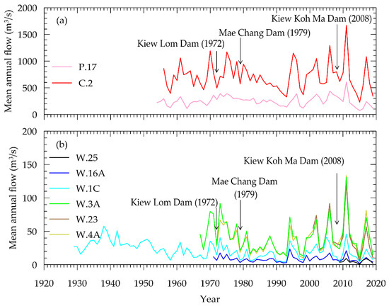 Because the Kiew Lom Dam could only store about 19% of the river runoff, the Kiew Koh Ma Dam was constructed and completed in 2008 to enhance the water resource capacity in the Wang River Basin. The dam was built 345 km upstream of the Wang River outlet with a reservoir capacity of 172 × 106 m3 [72]. Construction of the Kiew Koh Ma Dam had an obvious effect on the slope of the DMC at W.16A (Figure 7a). However, changes in slope of the DMC at W.1C, W.3A, and W.4A, including P.17 and C.2 were not seen. The dam directly affected sediment load in the upper reach. The river runoff upstream of the dam (W.25) varied between 15 × 106 and 300 × 106 m3/y with an average of 160 × 106 m3/y, and the dam captured more than 50% of the annual river runoff, causing rapid sediment reduction downstream. However, because the Kiew Koh Ma Dam is located in the uppermost reaches of the river basin, sediment supplied from the downstream river basin compensated for the impact of the dam. Sediment load in the Wang River accounted for about 10% of the CPR, while the effect of construction of the Kiew Koh Ma Dam on the CPR system was diminished by sediment supplied from other major rivers such as the Nan River [5].