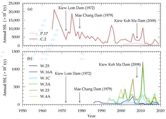 Time series of annual SSL at each hydrological station observed from 1965 to 2019 are presented in Figure 5, and results from the basic statistical analysis of daily SSL data are summarized in Table 1. Analysis of daily sediment data indicated that suspended sediment load increased toward downstream. In the upper reach, the SSL varied between 0 and 47,554 t/d with an average SSL of 80 and 140 t/d at W.25 and W.16A, respectively. Maximum SSL of 47,554 t/d occurred near the sub-basin outlet (W.16A) during the Thailand Great Flood of 2011. MK analysis on sediment data at W.16A from 1986 to 2019 indicated that the SSL of the upper basin had a statistically decreasing trend (p-value = 0.0036; Table 1). Between 1986 and 2007, the upper basin yielded annual SSL of 16,000–220,000 t/y with an average of 100,000 t/y. However, annual SSL plummeted to 1000–28,000 t/y after the Kiew Koh Ma Dam became operational in 2008.