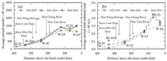 The summation of SSL and BL represents the total sediment load (TSL) transported along the river. TSL at each hydrological station was estimated to evaluate the variability of sediment load along the Wang River, including the effects of damming on sediment loads supplied to the CPY River system. Measured SSL data were discontinuous and only available for a few recent decades in some locations. Therefore, Equations (8)–(16) were used to estimate missing SSL data at each hydrological station (pre- and post-construction of the three major dams). The BL at each station along the Wang River was approximated using the BL/SSL ratios observed at the corresponding sites (XW.1 for W.25, XW.10 for W.16A, XW.14 for W.1C, XW.15 for W.23, and XW.17 for W.4A), while BL values at P.17 and C.2 were calculated using the BL/SSL ratio studied by Namsai et al. [5] and Bidorn et al. [35], respectively. Time series and a statistical summary of estimated annual TSL along the Wang River Basin between 1929 and 2019 are presented in Figure S2 and Table 3, respectively. Based on river flow and sediment load averaged over the same time periods (1972–2007, 2001–2019, and 2009–2019), variations in average river flow and total sediment load along the Wang River were plotted, as shown in Figure 6a,b, respectively. Results indicated that streamflow along the Wang River at each time period generally increased toward downstream but slightly fluctuated along the lower reach. Average TSL tended to increase downstream and ranged 0.001–0.036 × 106 t/y along the upper and middle reaches. The TSL increased in the lower reach (0.01–2.14 × 106 t/y), while maximum TSL value occurred at the mid-point of the basin with an average of 0.45 × 106 t/y (Table 3). Results from the trend analysis revealed that TSL at the Wang River outlet (W.4A) showed no increasing or decreasing trend, although a statistically significant decreasing trend was found at the upper, middle, and lower reaches.