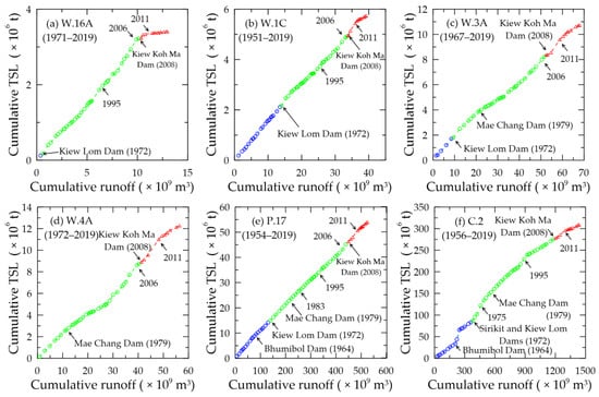 Plots showing cumulative annual runoff and total sediment load of the Wang River: (a) W.16A; (b) W.1C; (c) W.3A; (d) W.4A; (e) P.17; (f) C.2; blue, green, and red points represent data during pre-construction of the Kiew Lom Dam, pre-construction of the Kiew Koh Ma Dam, and post-construction of the Kiew Koh Ma Dam, respectively.