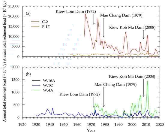 The Kiew Lom Dam as one of the older dams in Thailand was constructed in the upper reach 290 km from the Wang River outlet. The dam was completed in the same year as the Sirikit Dam on the Nan River as key components of the Great Chao Phraya Project [42]. The DMC of TSL at W.1C (Figure 7b) showed no obvious change in slope after 1972, except for a shift due to a flood in 1973. River runoff upstream of the dam (W.16A) ranged 60–740 × 106 m3/y with an average of 265 × 106 m3/y and reservoir storage of only 112 × 106 m3. Thus, less than 20% of the inflow can be impounded every year. Therefore, about 80% of the suspended sediment was still transported downstream from the dam almost every year, resulting in an insignificant change in the sediment load downstream.