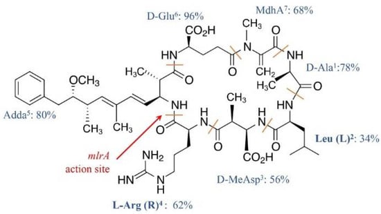 Ala1, MeAsp3, and Glu6 were D-amino acids. Adda5, or C20 amino acid (3-amino-9-methoxy-2, 6, 8-trimethyl-10-phenyldeca-4, 6-dienoic acid), and MdhA7 are non-proteinogenic amino acids; they contribute significantly to the toxicity of MCs and are also found in the structure of another cyanotoxin, i.e., nodularin [18].