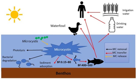 MCs can be taken up and gradually accumulate in aquatic plants and animals (Figure 2) that live in or use CyanoHAB-impacted waters [50]. Depending on locations in the food web (diets), organisms can have different bioaccumulation factors (BF = concentration in tissue vs. in ambient water) of MCs. Primary consumers, like filter feeders and herbivore fish, that graze on MC-producing cyanobacteria can have BF values over a wide range between 436–2409 [57]. Primary producers, like Hydrophytes in Lake Taihu, have also been shown to bioaccumulate MCs with a BF of 200–250 [58]. The bioaccumulation factor of MCs can vary seasonally [59]. Studies on freshwater fishes and mussels have revealed higher BFs in June and July (132.81) than colder months [58]. MCs can be accumulated even in the human body, through consumption of contaminated foods [58]. Bioaccumulation of MCs in humans differs among organs, and the liver typically showed concentrations (767 ng/g) that were different than other organs [60].