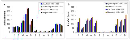 Rainfall data from four existing rainfall stations—Agricultural Seed Agency (ASA) Farm at Ngaramtoni with 50 years data trend (1969–2018), Arusha Airport with 51 years data trend (1960–2010), Arusha Urban Water Supply and Sanitation Authority (AUWSA) with 27 years data trend (1992–2018), and Tengeru Livestock Institute with 29 years data trend (1990–2018)—were used to analyse long-term trends and the amount of rainfall in the study area. The stations cover the southern and southwestern flanks. The average monthly rainfall data show that the area experiences a bimodal rainfall pattern (Figure 2a). The long “masika” rains extend from late February to late May, and the short “vuli” rains extend from early November to early January. The dry “kiangazi” season is from June to October.