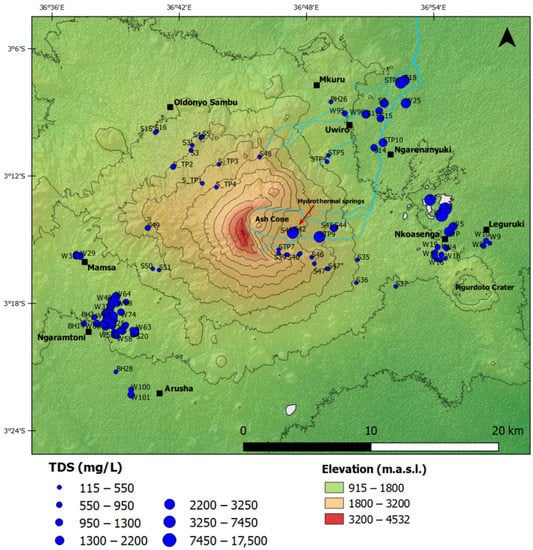 - Ghiglieri, G.; Pittalis, D.; Cerri, G.; Oggiano, G. Hydrogeology and hydrogeochemistry of an alkaline volcanic area: The NE Mt. Meru slope (East African Rift—Northern Tanzania). Hydrol. Earth Syst. Sci. 2012, 16, 529–541. [Google Scholar] [CrossRef]