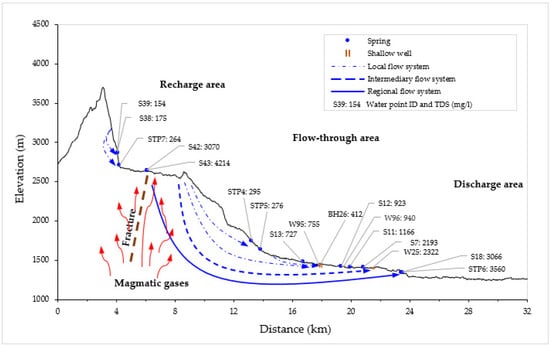 Figure 7 shows a simplified groundwater flow conceptual model for the northeastern flank of Mount Meru showing different flow systems: local, intermediary, and regional [,]. The model was developed based on hydrogeochemical processes, groundwater mineralisation, spring settings, and groundwater level in the shallow wells. The model suggests the influence of the volcanic gases in the groundwater chemistry of the two hydrothermal springs (S42 and S43) and the two springs from the discharge area (S18 and STP6), which are flowing from the deepest flow line [,,]. The model shows the increase of groundwater mineralisation with water residence times. The longer the flow path, the longer the residence time, hence high mineralisation.